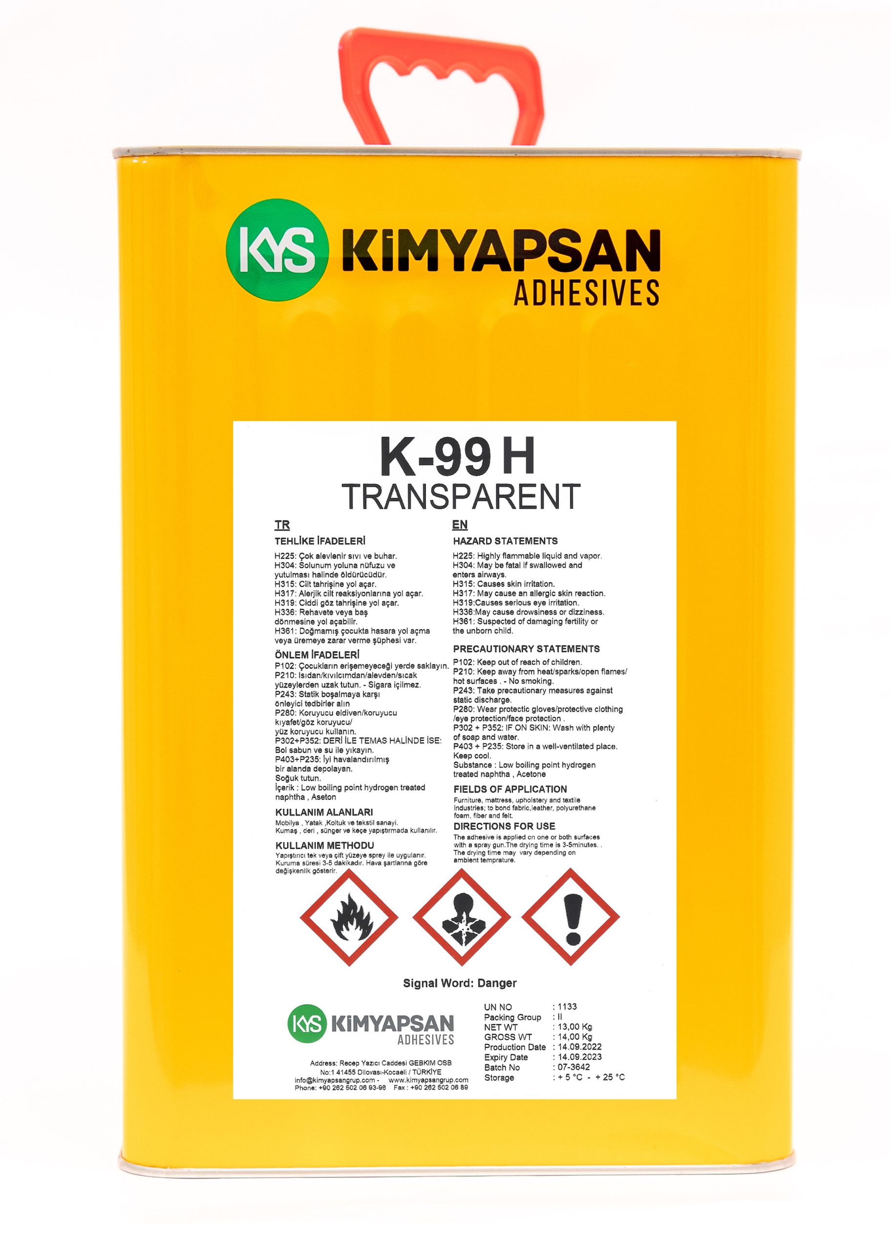 Klej tapicerski KIMYAPSAN K-99 H jest wysokiej jakości klejem szybkoschnącym przeznaczonym do klejenia wszelkich materiałów w przemyśle tapicerskim. Można go aplikować pędzlem oraz metodą natryskową.